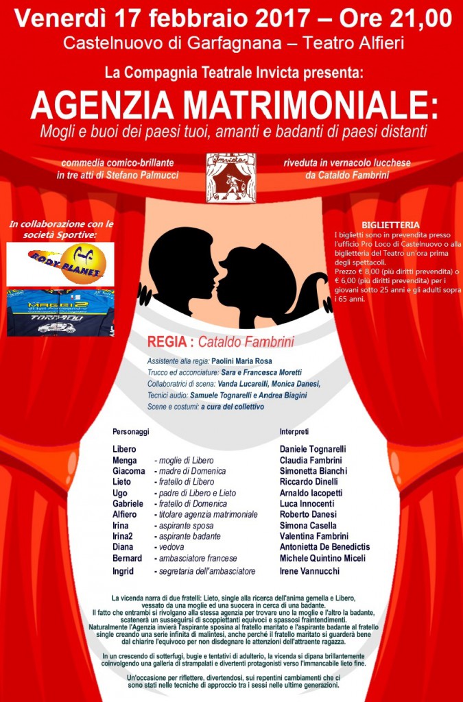 Si intitola “Agenzia matrimoniale†ed è una commedia scritta da Stefano Palmucci, riadattata al parlato “lucchese†dal regista della Compagnia Cataldo Fambrini. Lo spettacolo rientra nella rassegna “Alfieri gremitoâ€Â promossa dall’amministrazione comunale di Castelnuovo e la Fita Lucca.
