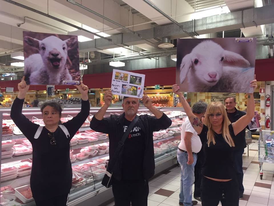 Flash mob degli animalisti alla Coop contro il consumo di carne d’agnello a Pasqua