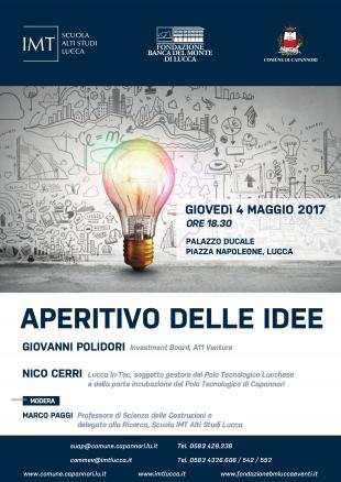 “Gli aperitivi delle idee†sono una nuova iniziativa varata dal Comune di Capannori in collaborazione con la Scuola IMT Alti Studi Lucca grazie al sostegno della Fondazione Banca del Monte di Lucca per creare un contatto diretto tra le eccellenze del mondo imprenditoriale del territorio e i giovani che aspirano a farne parte utilizzando una modalità informale come quella dell’aperitivo, un momento di socializzazione oggi molto diffuso tra le nuove generazioni. Un happy hour però diverso dal solito durante il quale i giovani potranno acquisire conoscenze sull’imprenditoria locale e soprattutto potranno avere un dialogo e un confronto diretto con imprenditori affermati. Allo stesso tempo gli imprenditori potranno acquisire idee e stimoli da portare in azienda.