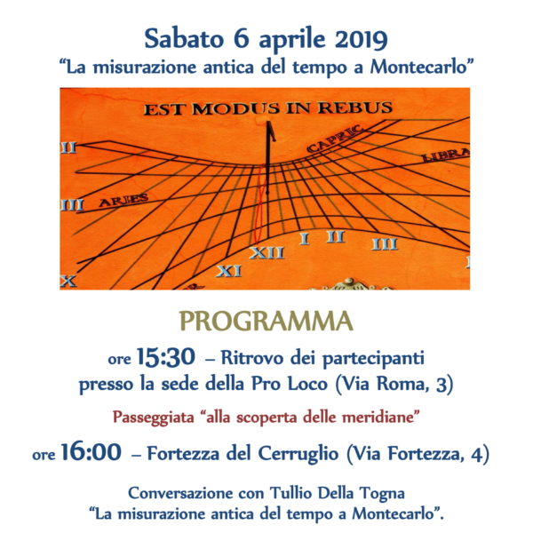si INFORMA che Sabato 6 aprile la sezione Pescia-Montecarlo-Valdinievole dell’Istituto Storico Lucchese, in collaborazione con l’associazione La Compagnia del Cerruglio e con la Pro Loco di Montecarlo, ha organizzato una passeggiata alla scoperta delle antiche meridiane del paese.