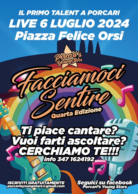 Grazie ad un gruppo di privati cittadini che hanno creato questa associazione, prosegue con la 4^ edizione del Concorso canoro gratuito “Facciamoci sentire” di Porcari’s Young Stars APS, riservato a ragazze e ragazzi della Lucchesia fino ai 20 anni di età che si svolgerà a Porcari in Piazza Felice Orsi il 6 luglio alle ore 21.15 nell’ambito delle iniziative dell’“Estate Porcarese”.