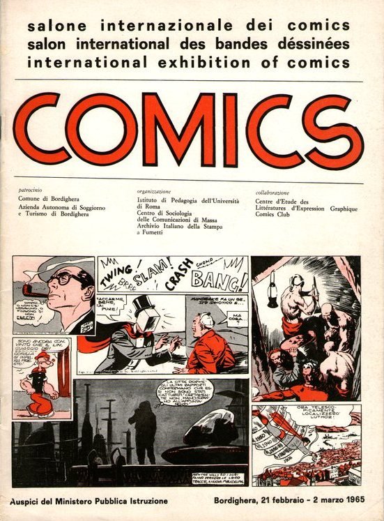 “Dal 21 febbraio al 2 marzo 1965 si terra’ a Bordighera la “1° Sala Internazionale dei Comics”, organizzata dall’Istituto di Pedagogia dell’Università di Roma, dal Centro di Sociologia delle Comunicazioni di Massa e dall’Archivio Italiano della Stampa a Fumetti, in collaborazione con il Comics Clubs e con il Centre d’Etude des Littératures d’Èxpression Graphique, con il patrocinio del Comune e dell’Azienda Autonoma di Soggiorno e Turismo di Bordighera.