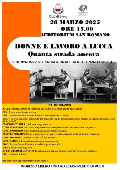Venerdì 28 marzo, alle 15.00 presso l’auditorium di San Romano, si conclude il mese di eventi dedicati alla Giornata internazionale della donna con “Donne e lavoro”, promossa dalla Commissione Pari Opportunità del Comune di Lucca in collaborazione con vari Enti e associazioni del territorio.