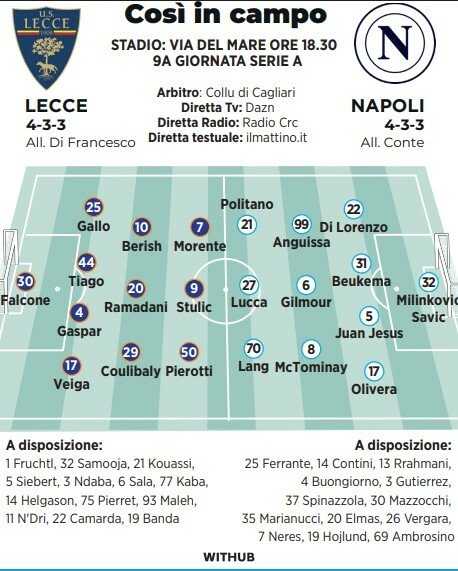Napoli (4-3-3): Milinkovic-Savic; Di Lorenzo, Juan Jesus, Buongiorno, Olivera; Anguissa, Gilmour, Elmas; Politano, Lucca, Lang. All. Conte.
