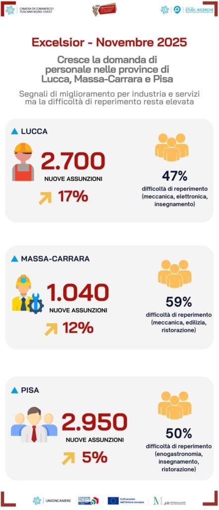 Nel mese di novembre, le imprese delle province di Lucca, Massa-Carrara e Pisa prevedono circa 6.700 nuove assunzioni. La crescita è guidata principalmente dal territorio lucchese, che mostra uno dei recuperi più significativi dell’area. Il bilancio rimane complessivamente positivo nell’intera area, anche sottraendo le entrate del settore agricolo, registrate per la prima volta da luglio. Nonostante la domanda sia in aumento, il mismatch rimane significativo: più della metà delle assunzioni previste riscontra ancora difficoltà di reperimento. Il problema è comune nelle tre province, con diversi livelli ma un elemento comune: i profili tecnici e gli operai specializzati continuano ad essere le figure più carenti, rallentando la capacità del sistema produttivo di soddisfare le proprie esigenze.