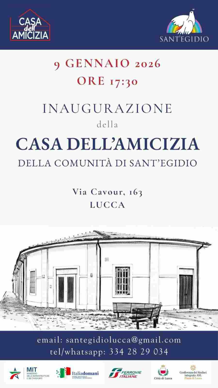 Venerdì 9 gennaio alle ore 17.30, in viale Cavour n. 167, si tiene l’inaugurazione della Casa dell’Amicizia, nuova sede delle attività della Comunità di Sant’Egidio a Lucca.