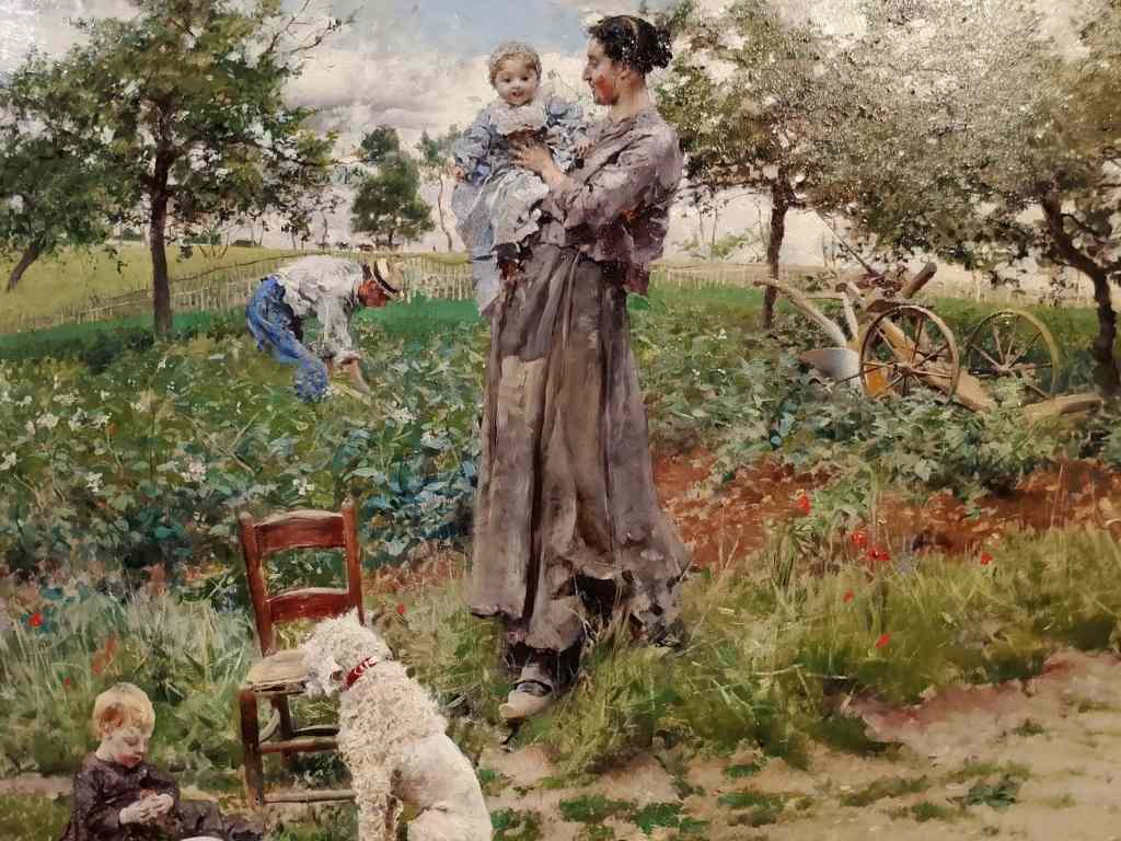 Dalla “lezione” dei colleghi toscani Boldini apprende uno stile pittorico caratterizzato da pennellate nette e decise di colore, una quasi maniacale attenzione ai dettagli, un vivace cromatismo e una rappresentazione di scene di vita quotidiana che sorprendono per la loro spontaneità e naturalità e rivelano l’aumento dell’indagine dell’artista ferrarese sull’aspetto psicologico dei personaggi ritratti. Le opere del primo periodo parigino durante gli anni Settanta mostrano già una maturità stilistica raggiunta, come nel bellissimo dipinto “La primavera” dove una scena di lavoro e vita rurale è catturata con straordinario realismo e con un abile uso del colore, senza indugiare in una rappresentazione idealizzante ma rimanendo radicato alla realtà.