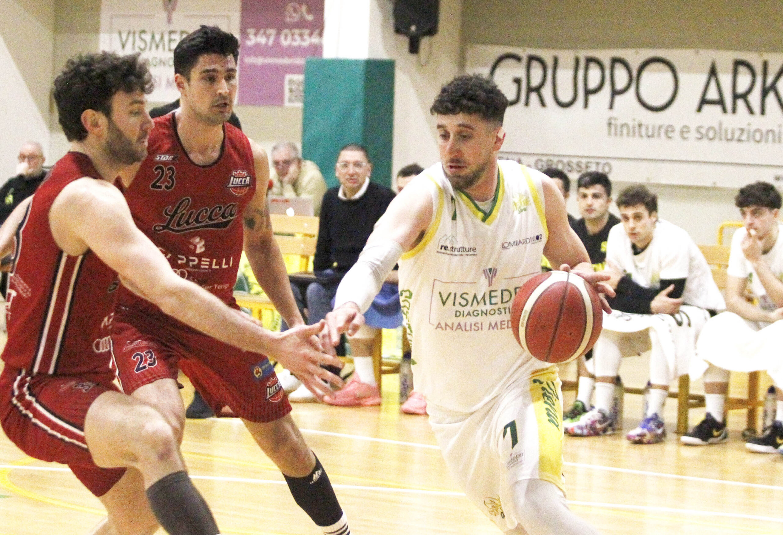 Il match inizia con un ritmo serrato da parte degli ospiti, che si portano subito sul 6-0. Masciarelli sblocca i gialloverdi, ma Drocker dalla lunga distanza e Dubois dal post basso portano il punteggio a 2-11 sul tabellone dopo nemmeno 4 minuti di gioco. Il capitano Nasello prova a infondere entusiasmo nei suoi con 4 punti, ma Valentini, con un tiro da tre punti e due liberi, riporta Lucca sul +11. Il numero 7 dei gialloverdi accorcia ancora il distacco con altri quattro punti, ma la bomba di Del Debbio mantiene la squadra ospite con un vantaggio doppio in cifra. Nel finale, i canestri di Zocca e Zeneli permettono ai padroni di casa di chiudere sul 14-22. Nel secondo quarto l’intensità fisica cresce e Matteo Paoli risponde a Dubois mantenendo il divario di -8 dopo 3 minuti di gioco. La squadra senese prova a rientrare con Ballabio e Zeneli, ma le triple di Valentini e poi Dubois respingono ogni tentativo di rimonta. Due viaggi alla linea del tiro libero fruttano tre punti ai padroni di casa, ma Trentin firma il 23-32 a 2 minuti e 30 secondi dall’intervallo. Nel finale, è ancora Matteo Paoli a scuotere i suoi con un tiro da tre punti e due liberi che valgono il -5. Dopo l’1/2 dalla linea del tiro libero di Trentin, l’ultimo tiro è di Rosso che segna e manda le squadre negli spogliatoi sul 30-34.
