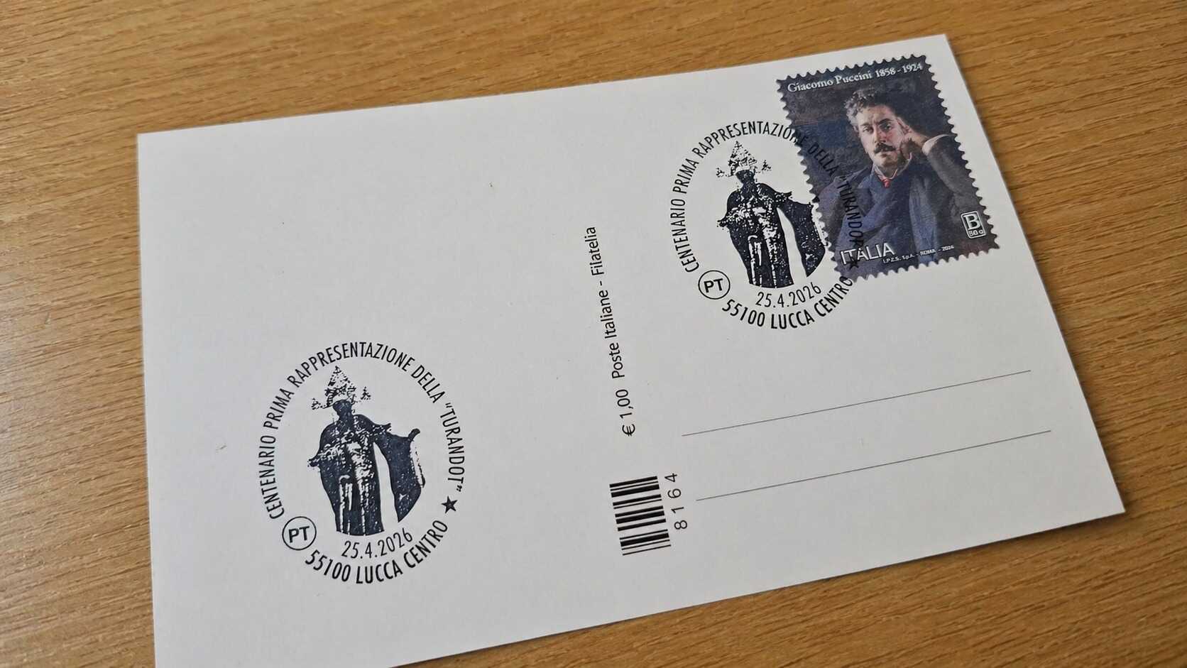 L’annullamento è stato apposto su una cartolina con la grafica di Turandot per il centenario in scena al Giglio. Questo passaggio rende l’oggetto duplice: da un lato è un documento postale, dall’altro una traccia della produzione teatrale programmata per lo stesso giorno. La cartolina ospita il timbro e lo contestualizza nel progetto lucchese del 2026.