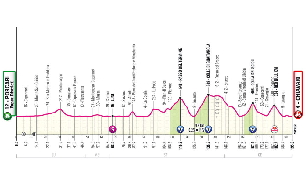 Ci sono troppi fattori da considerare per prevedere già oggi come andrà la tappa, ma sembra che la seconda parte, con salite non troppo difficili e numerosi saliscendi, sia disegnata su misura per gli scalatori. Infatti si affronterà prima il Passo del Termine e poi il Colle di Guaitarola (9,9 km con una pendenza media del 6,2%). Da qui una lunga discesa conduce alla breve salita di Colla dei Scioli, l’ultima prima di quella che segna il Chilometro Red Bull. Da qui si scende e poi si arriva a Chiavari.